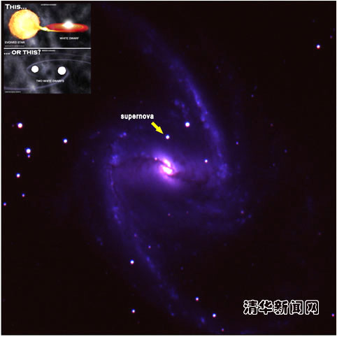 图为在邻近星系NGC 1365中爆发的Ia型超新星。一般认为是Ia型超新星源于双星系统中的白矮星爆炸。伴星可能是一个巨星,亚巨星,主序星,或另一颗白矮星。不同的前身星系统产生的Ia型超新星的光谱特征可能不同,这些性质可能与它们在宿主星系中的位置有关。