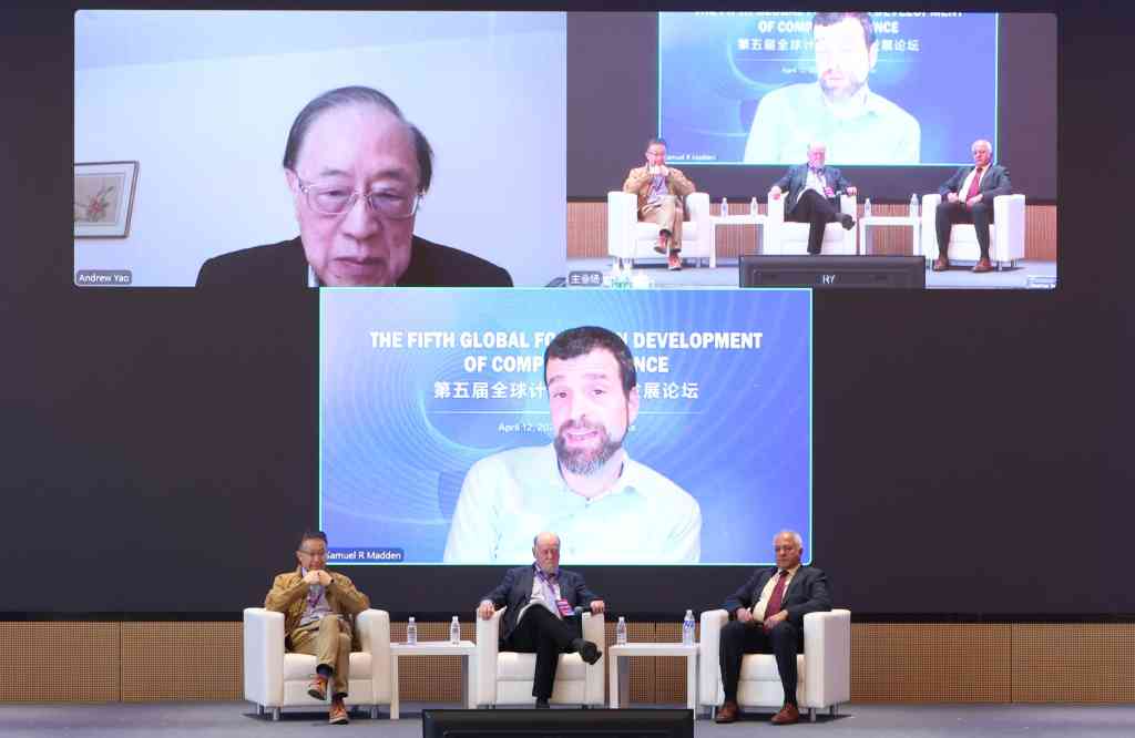 姚期智、杰克·唐加拉,以及三位主旨演讲嘉宾围绕“人工智能时代的计算机学科发展”进行了专题研讨。
