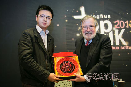 图为校研究生会主席刘博涵代表清华学子向爱德蒙·克拉克赠送礼物。 研通社记者 王皓冉