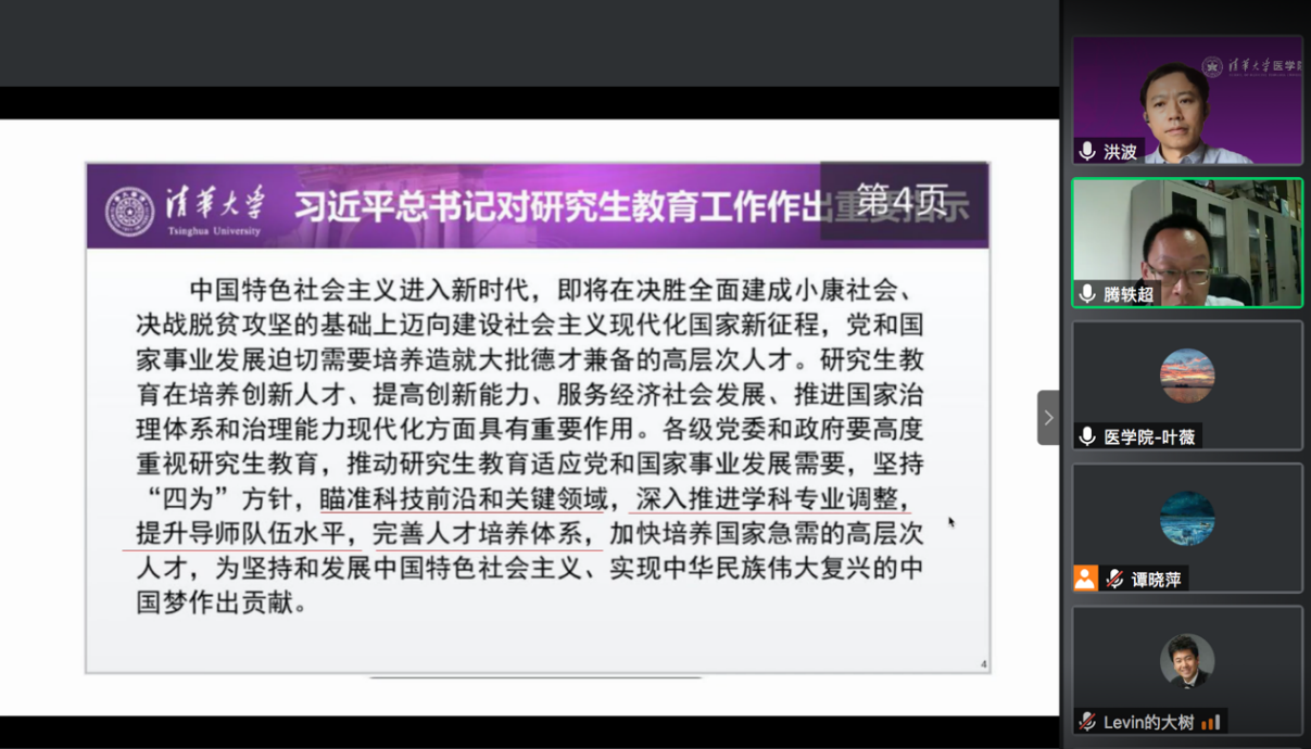 清华新闻网8月4日电 7月31日下午,医学院(药学院)党委召开线上扩大会,学习传达习近平总书记重要指示和全国研究生教育会议精神。医学院党委书记洪波、学位委员会主席王广志、党委副书记程功、党委学生工作副书记程峰、研究生工作组长腾轶超、教务办主任夏永静、研工组副组长王大亮、药学党支部书记刘清飞以及医学院药学院党委委员、教职工支部书记、党委办公室职员共21人参加。会议由党委书记洪波主持。