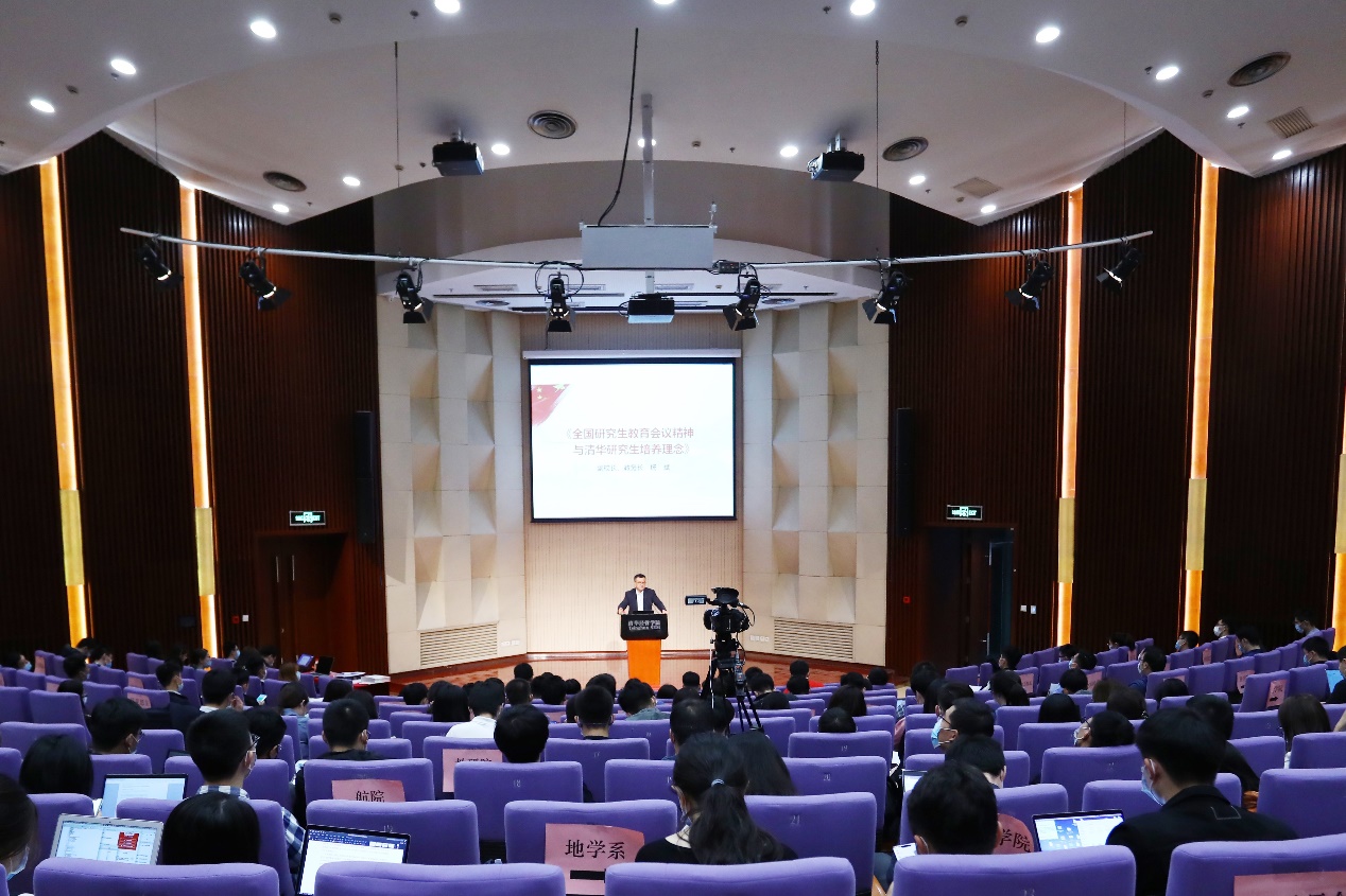 副校长、教务长杨斌作了题为“全国研究生教育会议精神与清华研究生培养理念”的开班报告。杨斌首先指出,新中国成立以来首次召开的全国研究生教育会议,对于未来研究生教育工作具有重要指引作用。研究生德育工作助理作为参与研究生教育工作的一份子,要深切领会全国研究生教育会议精神,对会议所带动的改革方向和创新发展要求有准确、全面的把握,充分展现思想上的先进性、全局性和预判性,扮演好教育他人、教育自己的双重角色。杨斌继而以“无需求不质量”展开,详细阐述了如何树立正确的研究生教育质量观,并进一步解读了全国研究生教育会议的及时性、重要性与时代性。