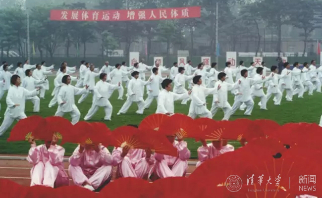2001年,来到90周年校庆,第44届学生田径运动会(马约翰杯)开幕式团体操表演。