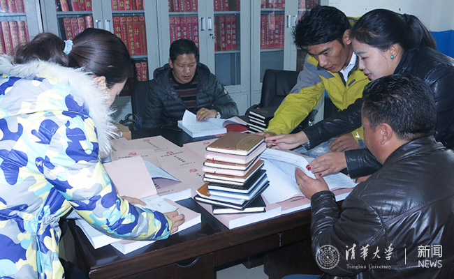 尕朋(左一)赴家乡玉树调查重建恢复实践。