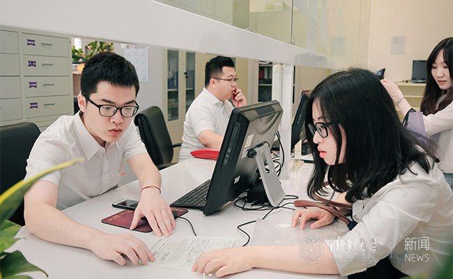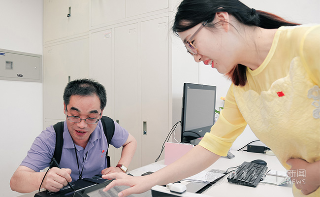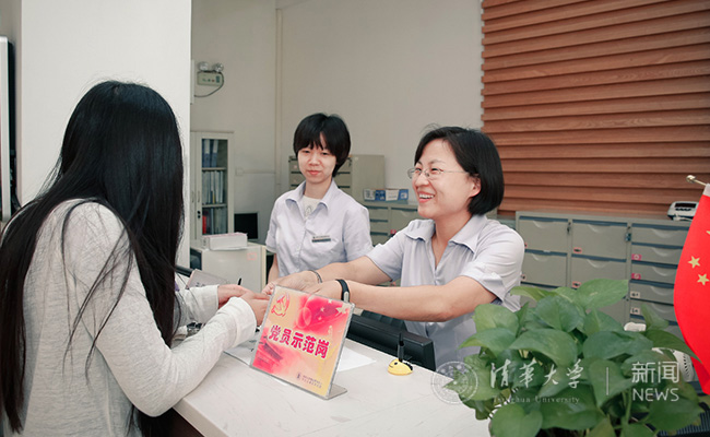 国际处共产党员夏丰娜为教师办理手续。记者 张宇 摄