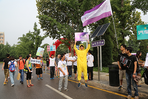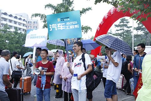 在紫荆学生公寓综合服务楼前,到处洋溢着欢声笑语。每当一辆载满新生和家长的清华校车停靠在路口,早已在那里等候多时的各院系迎新志愿者便蜂拥而上,高举院系指示牌,帮助新生快速找到自己院系。极富院系特色的卡通人物随乐而舞,新生一下车,便展开双臂送上大大的拥抱。