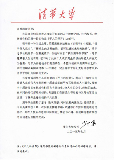在随书附上的签名信中,邱勇深情地写道:“在祝贺你们即将进入清华开启新的人生旅程之际,作为校长,我送给你们的第一份礼物是《平凡的世界》这部书。读书是一种生活态度,好书蕴藏着人生的哲理,读书对于处在个人成长黄金阶段的年轻人而言尤为重要,与书为伴将使你们受益终生。”