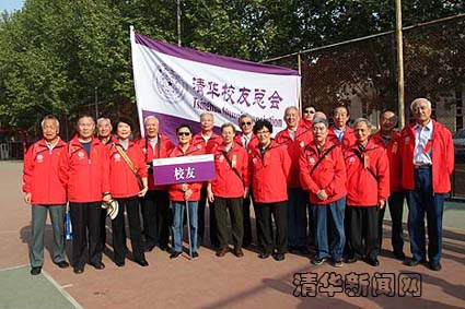 走在最前面举牌的是当年的运动健将牛淑芳学长(1980级化工),孙路学长(1979级电机)高举着紫白两色的校旗,后面是清华校友总会新任秘书长唐杰老师。校友们个个意气风发、步伐矫健,重回母校的运动场,让他们无比自豪。队伍中,最年长的是1959届校友,已经年近八旬;还有一多半是毕业50周年以上的老学长,他们已经圆满完成蒋南翔校长健康工作50年的要求,清华养成的体育锻炼习惯给他们的人生和事业增添了无穷的力量。
