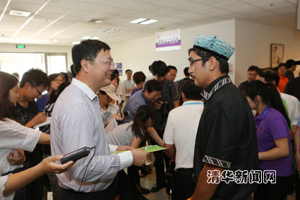图为校长陈吉宁与走“绿色通道”的新疆新生努尔艾力·麦麦提交流。记者 智 斐 摄