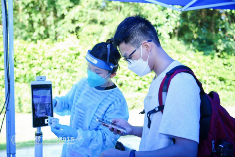 为使新生们更加方便快捷地办理各项报到手续,同时进一步保障疫情防控期间迎新工作有序高效地开展,深圳国际研究生院采用“数字化迎新”模式,进行线上签署住宿协议以及线上住宿费缴纳,并从以往的移动端H5架构升级为微信小程序架构。同学们在入学前通过“SIGS迎新”微信小程序,根据指引提前完成了信息填报、入校申请等手续。同时,在新生入口处增设了3台“电子哨兵”核验核酸检测信息。